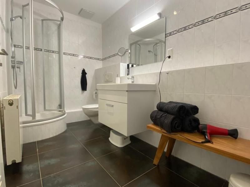 Das moderne Badezimmer im Obergeschoss bietet eine Dusche, ein WC, ein Waschbecken mit Unterschrank, einen Handtuchtrockner sowie praktische Ablageflächen für Ihre Badutensilien.