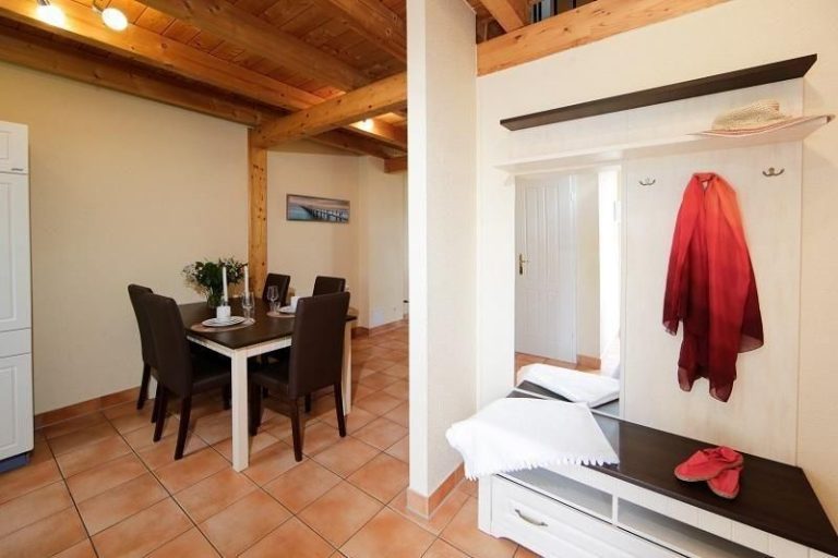Der Eingangsbereich empfängt Sie mit einer einladenden Diele inklusive Garderobe mit großem Spiegel sowie einem separaten Abstellraum, in dem Sie bequem Gepäck, Vorräte oder Strandausrüstung unterbringen können.