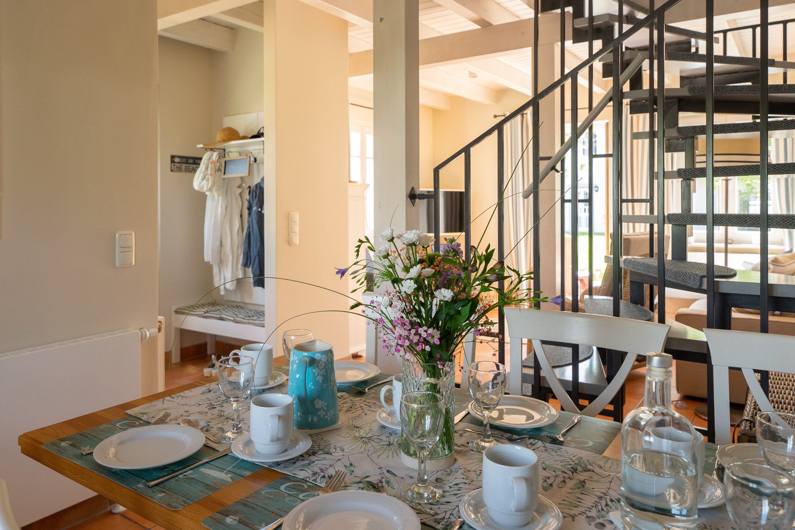 Der Eingangsbereich empfängt Sie mit einer einladenden Diele inklusive Garderobe sowie einem separaten Abstellraum, in dem Sie bequem Gepäck, Vorräte oder Strandausrüstung unterbringen können.