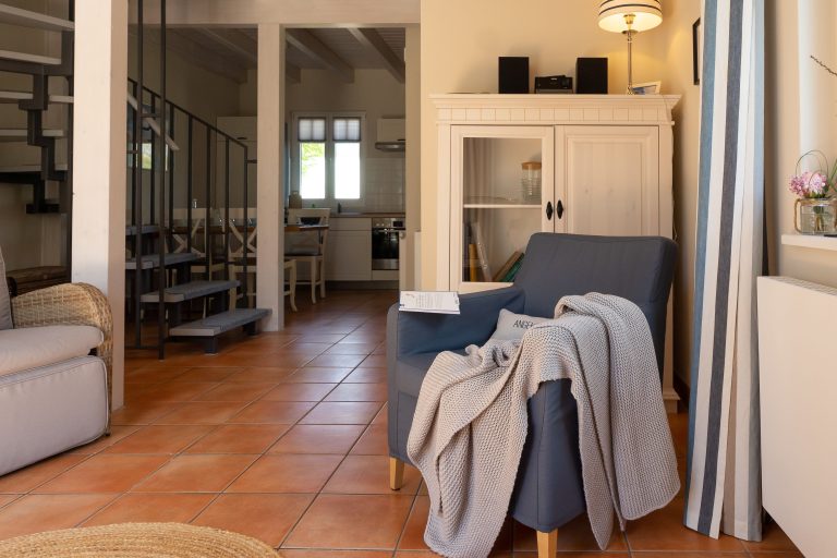 Im Erdgeschoss erwartet Sie ein liebevoll gestalteter Wohnbereich mit zwei bequemen Sesseln und einer gemütlichen Schlafcouch, die sich bei Bedarf in einen komfortablen Schlafplatz für zwei Personen verwandeln lässt. Warme Farben, stilvolle Dekoration und hochwertige Möbel schaffen eine behagliche Atmosphäre – perfekt für entspannte Abende nach einem erlebnisreichen Tag an der Ostsee.