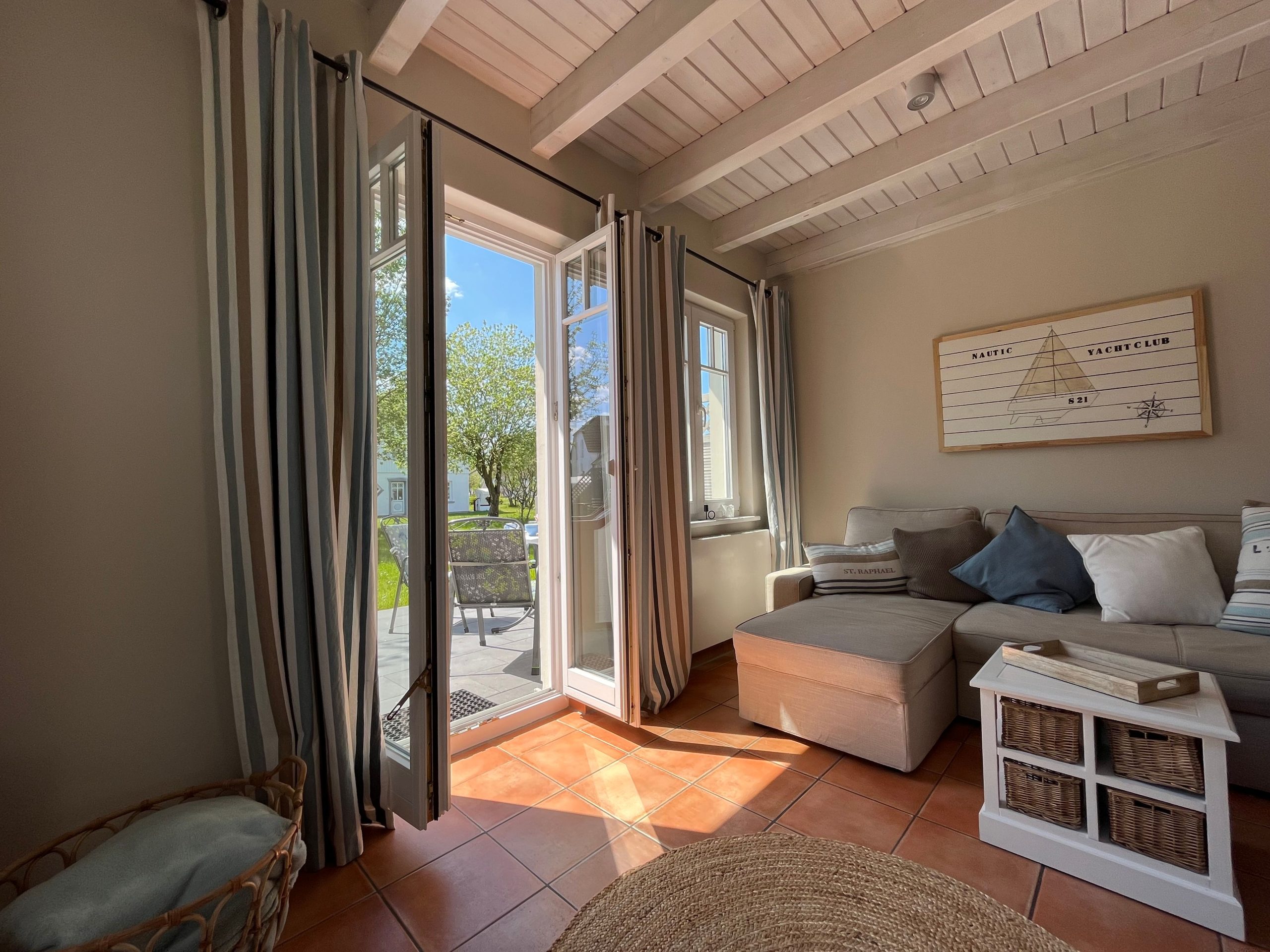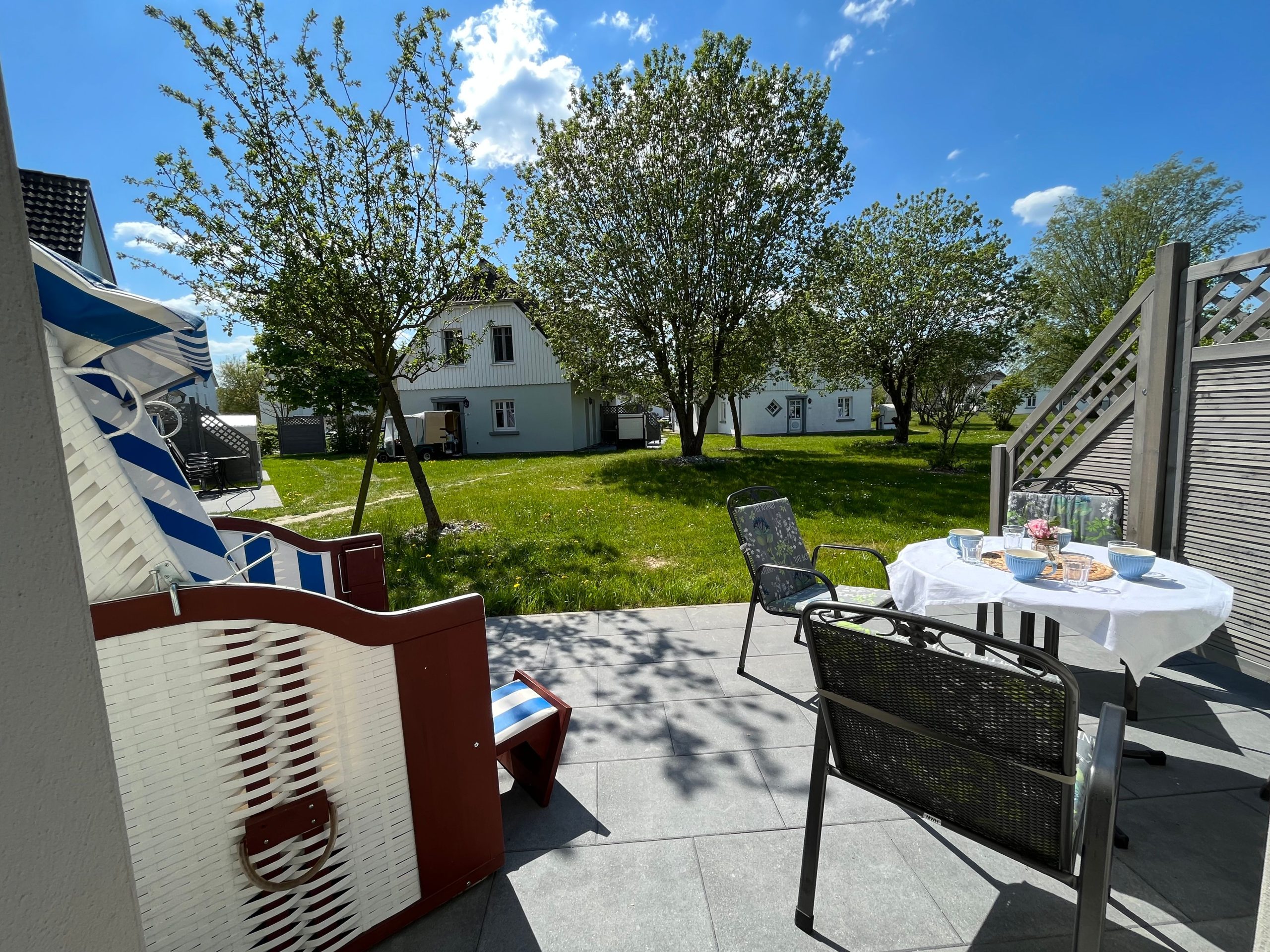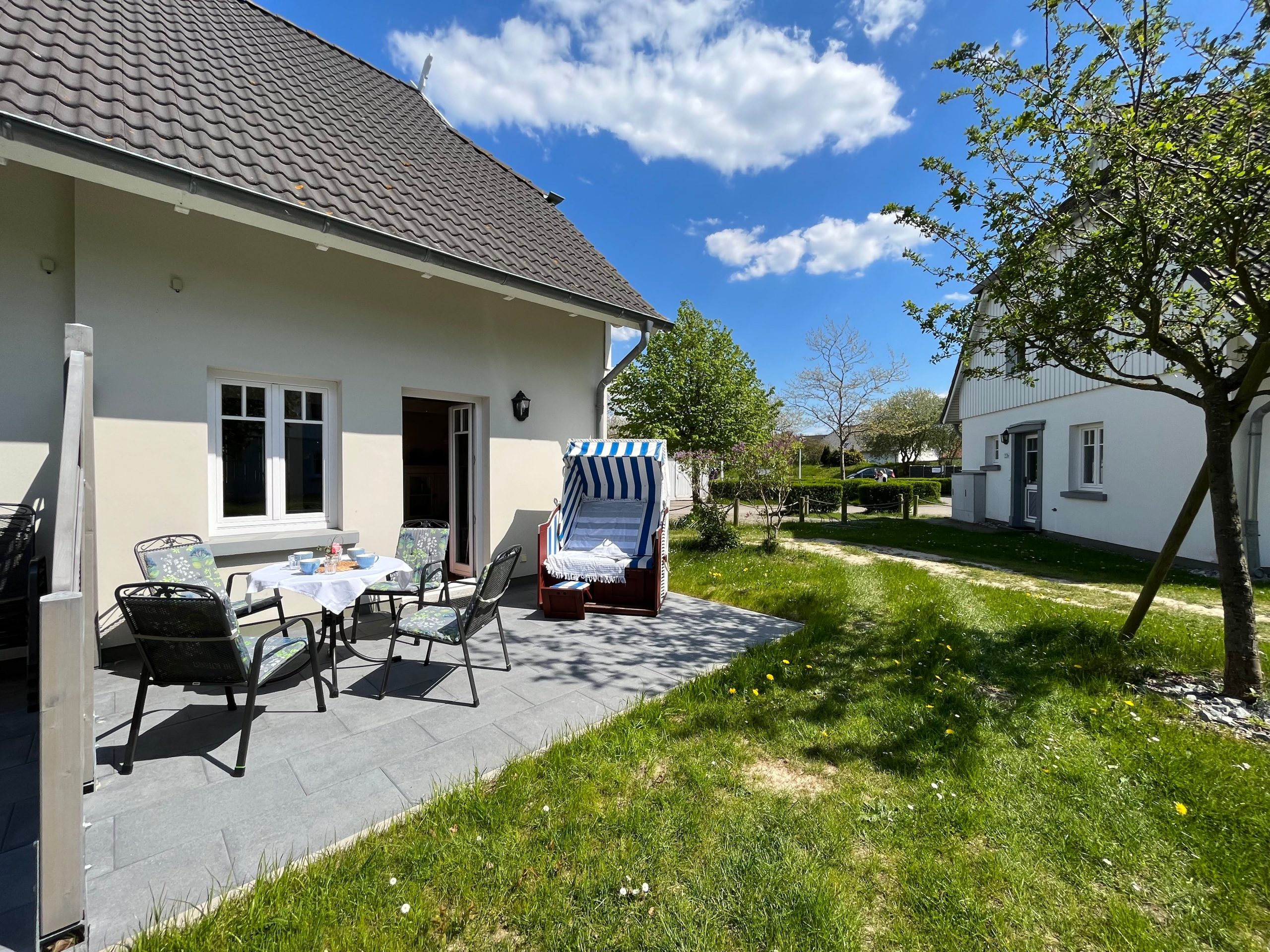 Genießen Sie das Ostsee-Feeling mit der ganzen Familie auf der romantisch anmutenden Terrasse, die Ihnen einen fantastischen freien Blick auf die Ruhe ausstrahlende Umgebung mit weitläufigen Rasenflächen, die das Ferienhaus umfassen, bietet. Moderne Gartenmöbel und ein hübscher Strandkorb laden zum gemütlichen Verweilen ein und vervollständigen das harmonische Ambiente im Außenbereich des Hauses.