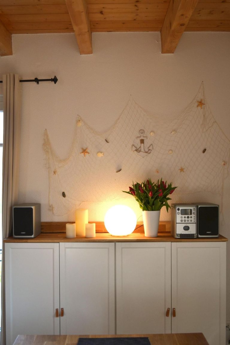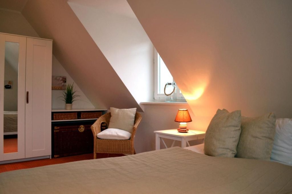 Im Erdgeschoss erwartet Sie ein liebevoll gestalteter Wohnbereich mit zwei bequemen Sesseln und einer gemütlichen Schlafcouch, die sich bei Bedarf in einen komfortablen Schlafplatz für zwei Personen verwandeln lässt. Warme Farben, stilvolle Dekoration und hochwertige Möbel schaffen eine behagliche Atmosphäre – perfekt für entspannte Abende nach einem erlebnisreichen Tag an der Ostsee.