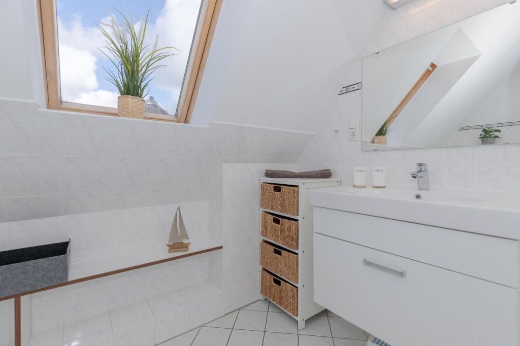 Der Eingangsbereich empfängt Sie mit einer einladenden Diele inklusive Garderobe sowie einem separaten Abstellraum, in dem Sie bequem Gepäck, Vorräte oder Strandausrüstung unterbringen können. Ein Gäste-WC im Erdgeschoss rundet den durchdachten Grundriss ab.