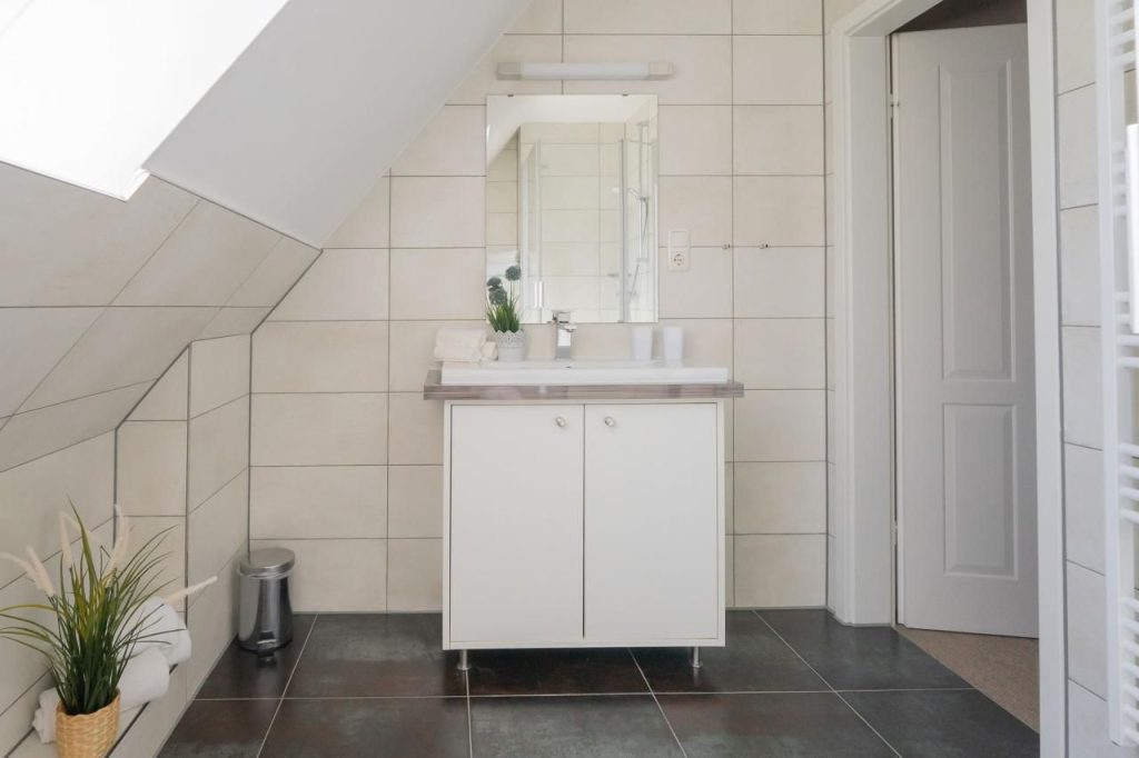 Das moderne Badezimmer bietet alles, was Sie für einen entspannten Start in den Tag brauchen: Dusche, WC, Waschbecken mit großzügigem Unterschrank, Handtuchtrockner und ausreichend Ablageflächen für Ihre Pflegeprodukte.